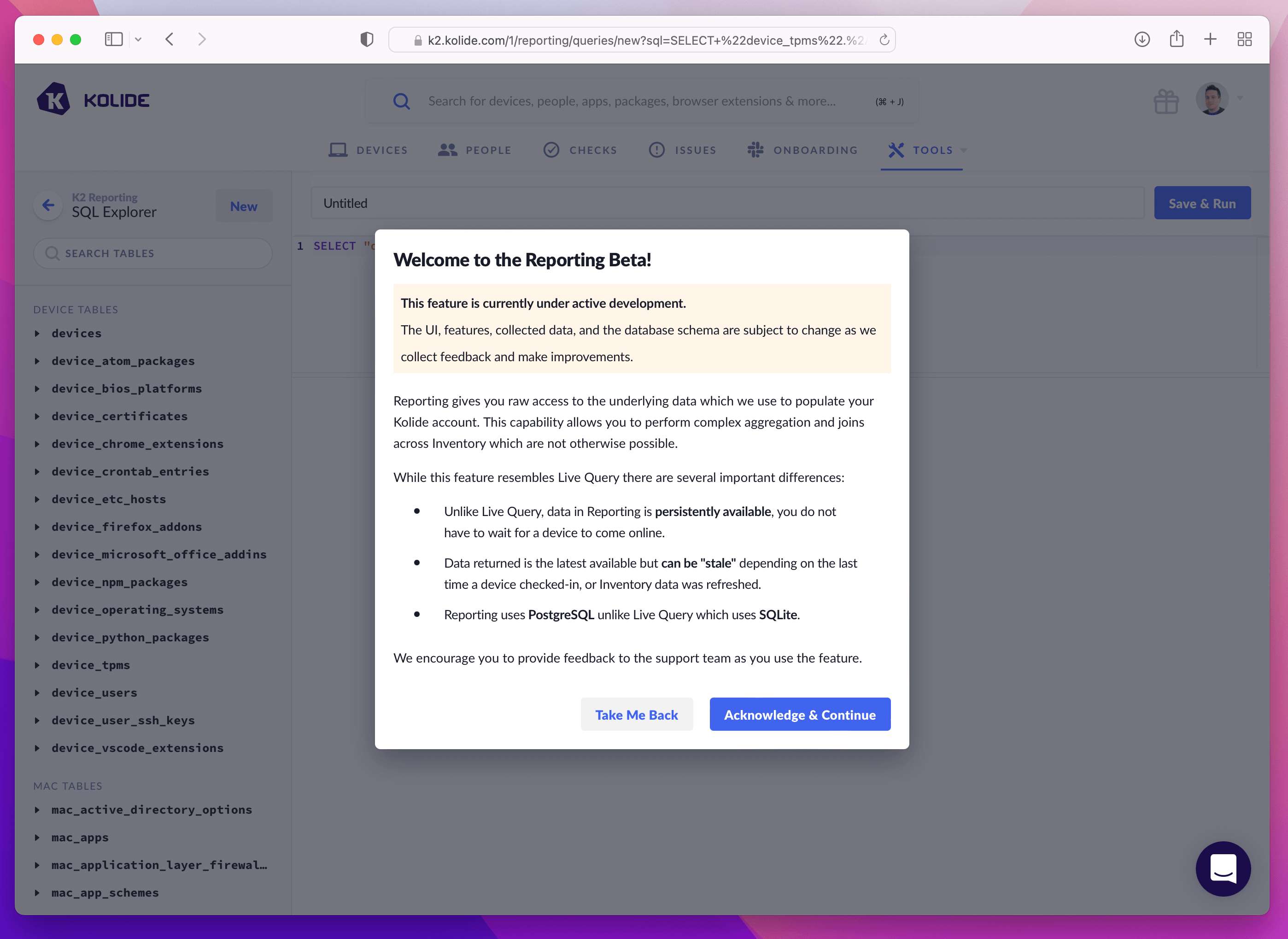 We plan to improve our Device Property documentation further and integrate it with the Reporting DB experience. We believe writing your own queries against the data Kolide collects will be a powerful concept and would love your feedback on this beta feature so we can refine it over the course of this year.