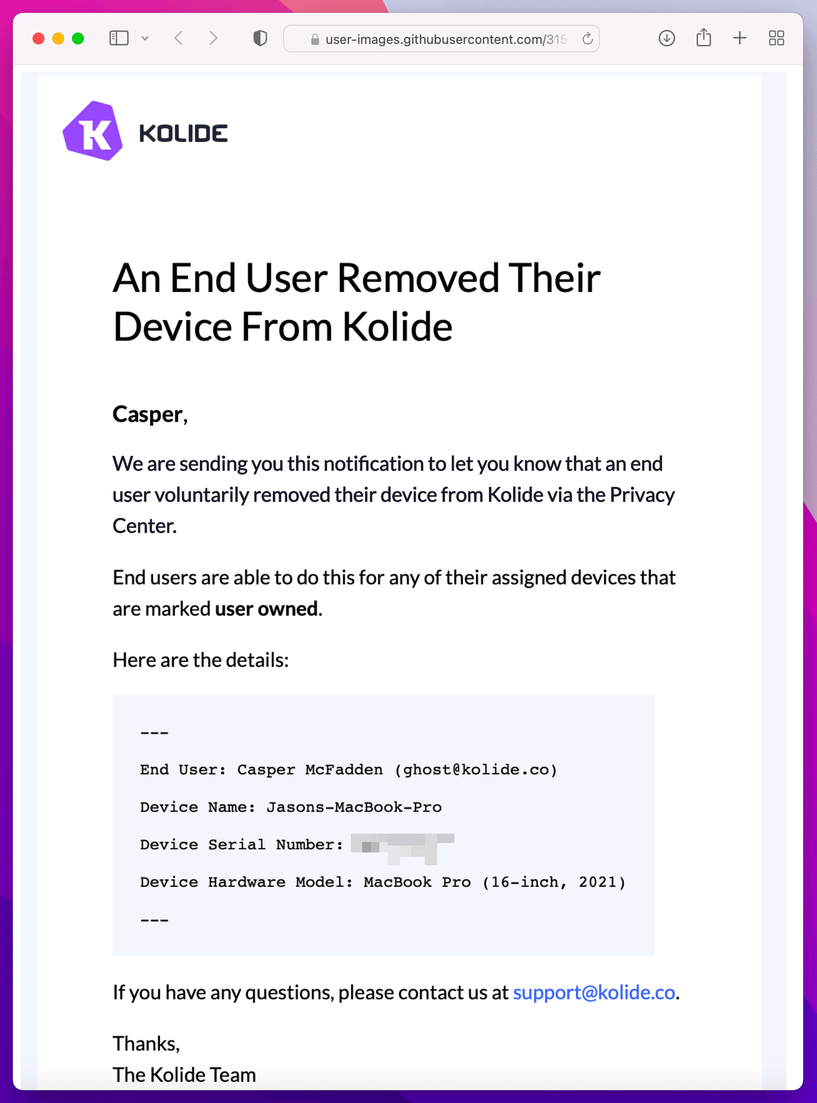 While rare, sometimes end users enroll the wrong device into Kolide. After realizing this, users often feel stressed and need to ask either Kolide’s support or an admin on their team to help them remove the device.