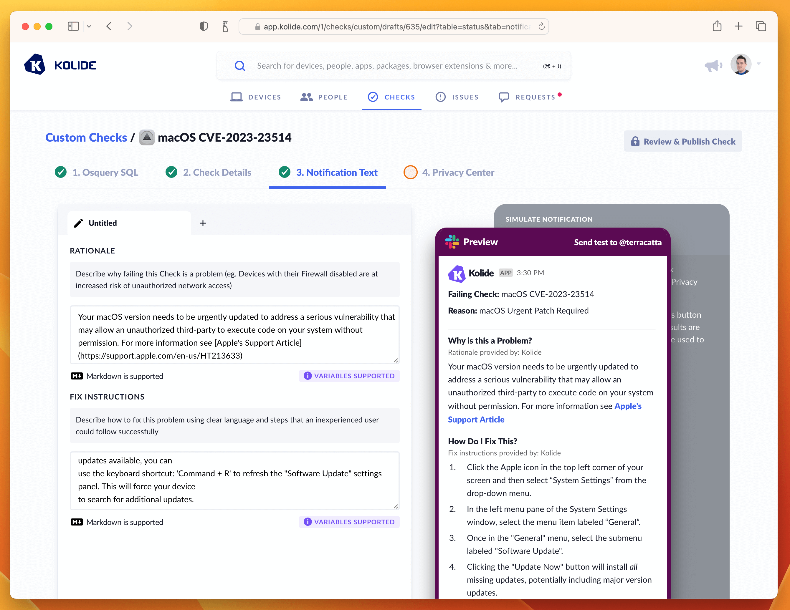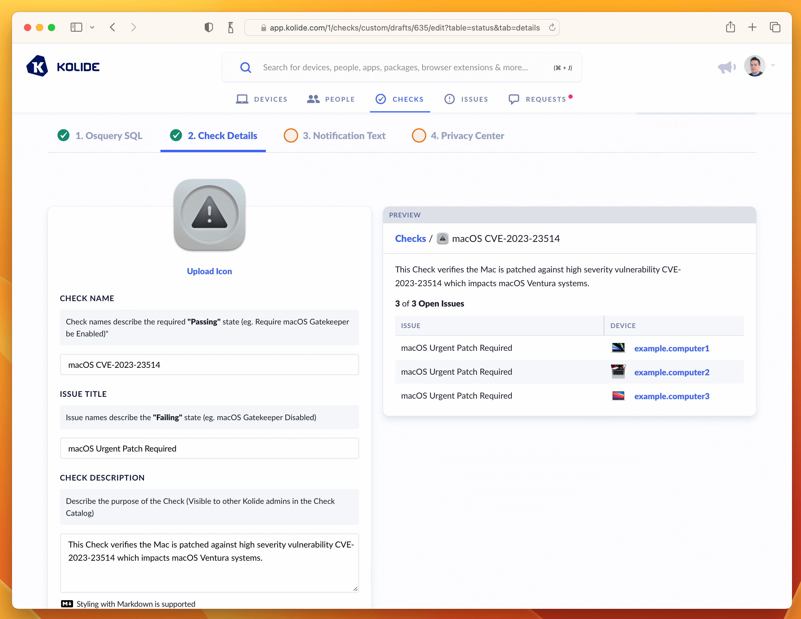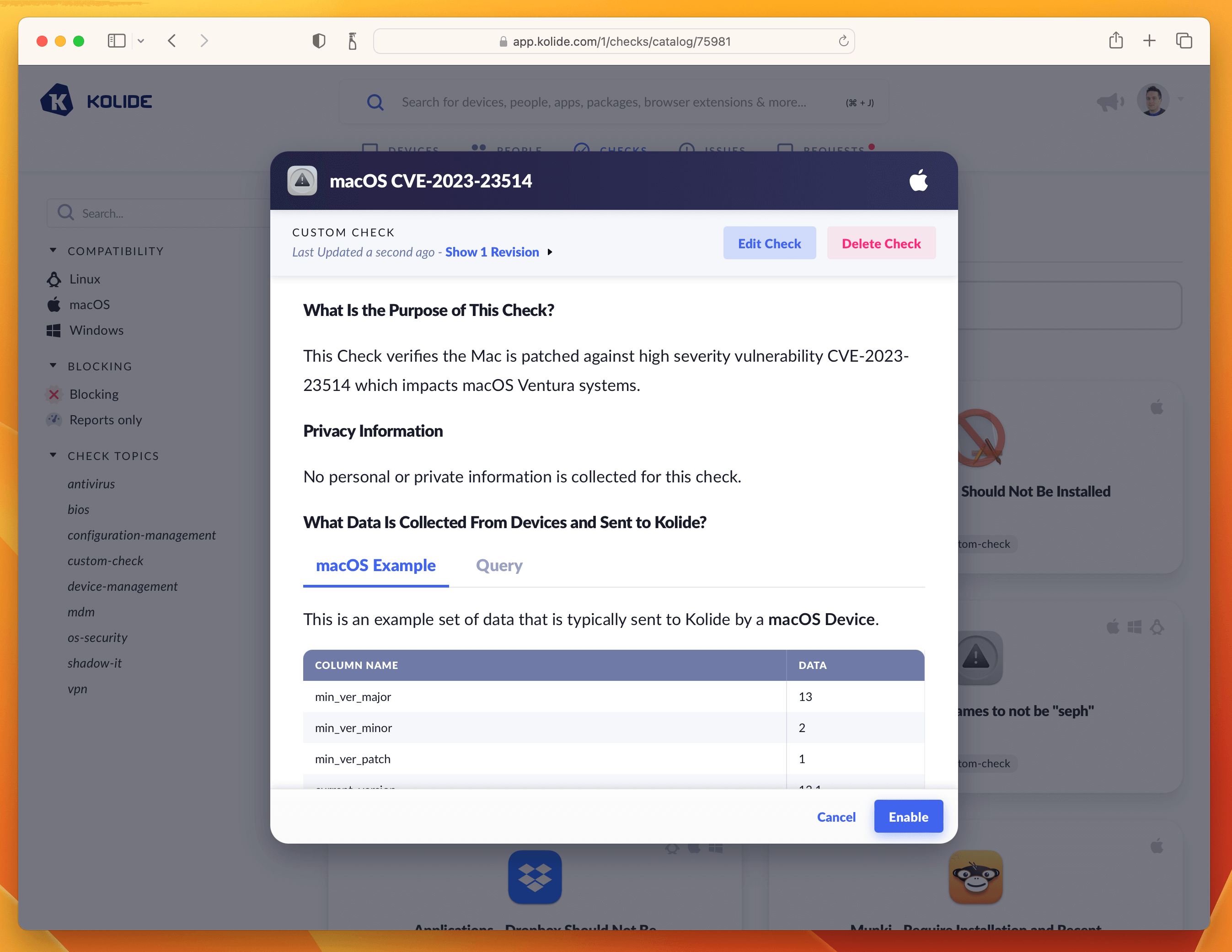 Even though Kolide has built-in Checks for ensuring macOS has recent patches, we will want to create a separate Check for each of these vulnerabilities. Why? Well there are several reasons: