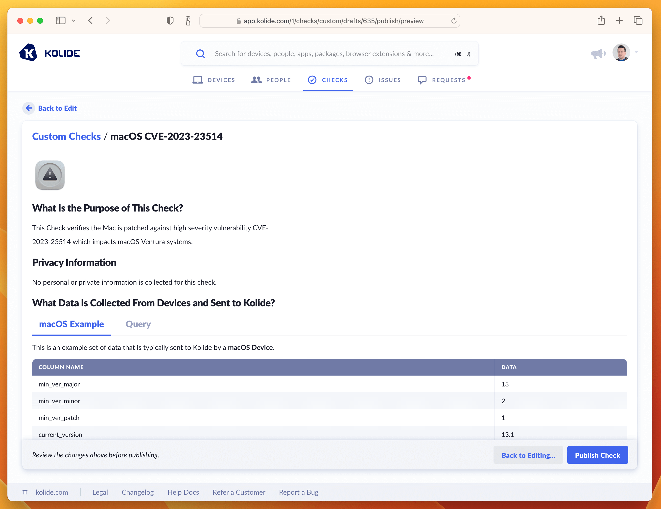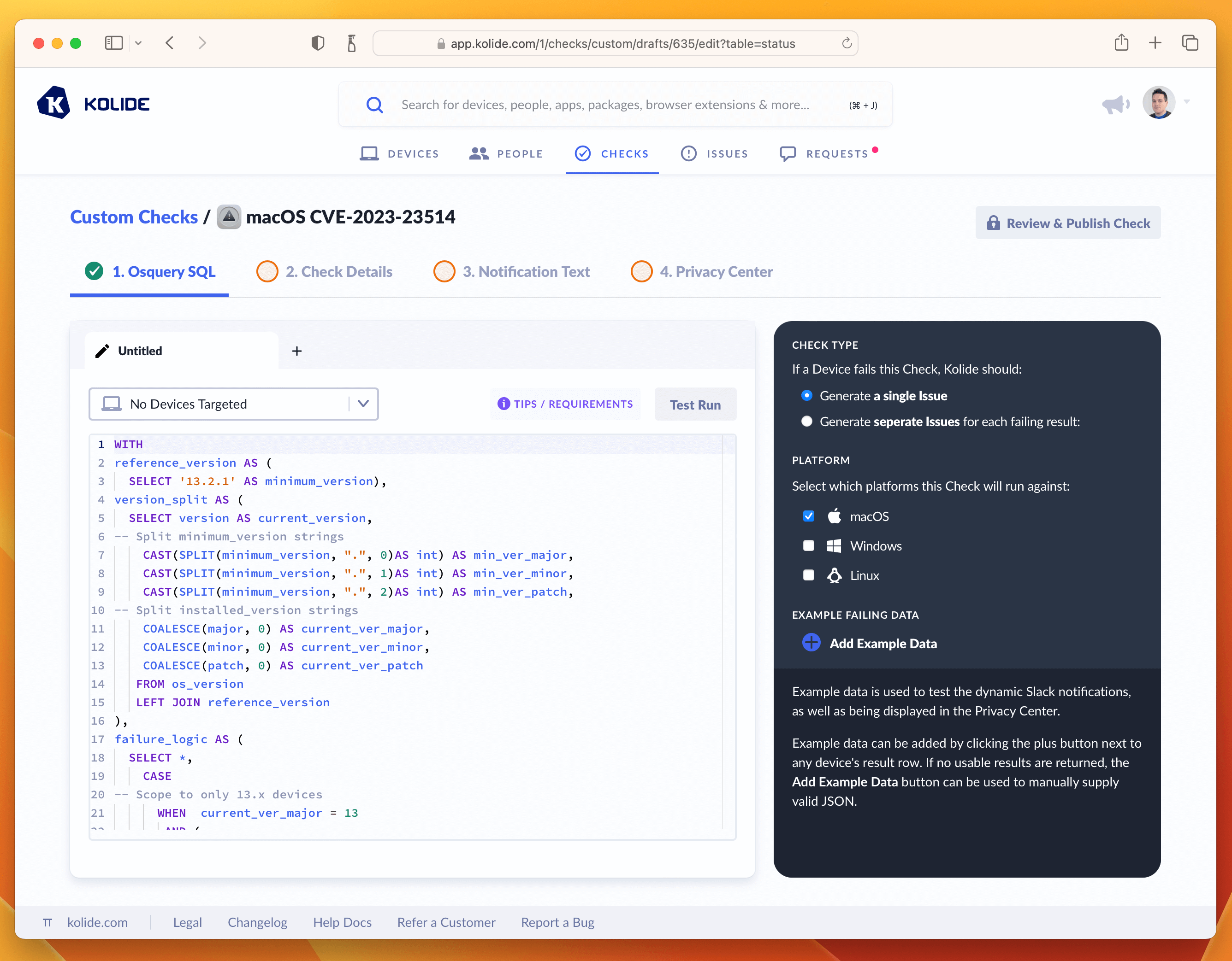 WITHreference_versionAS(SELECT'13.2.1'ASminimum_version),version_splitAS(SELECTversionAScurrent_version,-- Split minimum_version stringsCAST(SPLIT(minimum_version,".",0)ASint)ASmin_ver_major,CAST(SPLIT(minimum_version,".",1)ASint)ASmin_ver_minor,CAST(SPLIT(minimum_version,".",2)ASint)ASmin_ver_patch,-- Split installed_version stringsCOALESCE(major,0)AScurrent_ver_major,COALESCE(minor,0)AScurrent_ver_minor,COALESCE(patch,0)AScurrent_ver_patchFROMos_versionLEFTJOINreference_version),failure_logicAS(SELECT*,CASE-- Scope to only 13.x devicesWHENcurrent_ver_major=13AND(-- Check major versions(min_ver_major>current_ver_major)-- Check minor versionsOR(min_ver_major>=current_ver_majorANDmin_ver_minor>current_ver_minor)-- Check patch versionsOR(min_ver_major>=current_ver_majorANDmin_ver_minor>=current_ver_minorANDmin_ver_patch>current_ver_patch))THEN'FAIL'-- Passing Condition: Pass all 12.x versions or < 13.2.1 versionsWHENcurrent_ver_major<13OR(min_ver_major<=current_ver_majorANDmin_ver_minor<=current_ver_minorANDmin_ver_patch<=current_ver_patch)THEN'PASS'ELSE'UNKNOWN'ENDASKOLIDE_CHECK_STATUSFROMversion_split)SELECT*FROMfailure_logic;Paste the SQL into the editor. Once inserted, do a test-run against a few devices and add an example to the sidebar. This will be useful for the last step when we fill out the Privacy Center information.