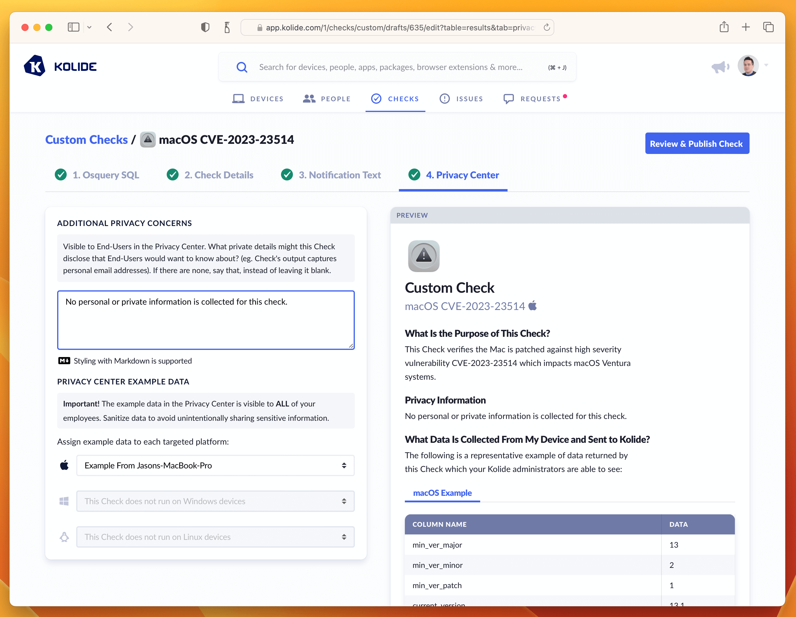 If that’s looking good, then let’s quickly deal with the Privacy Center tab. This Check does not have any impact on Privacy, so we can simply select the example we generated in the Osquery SQL tab and type in a short-message letting end-users know there isn’t any personal data collected for this Check.