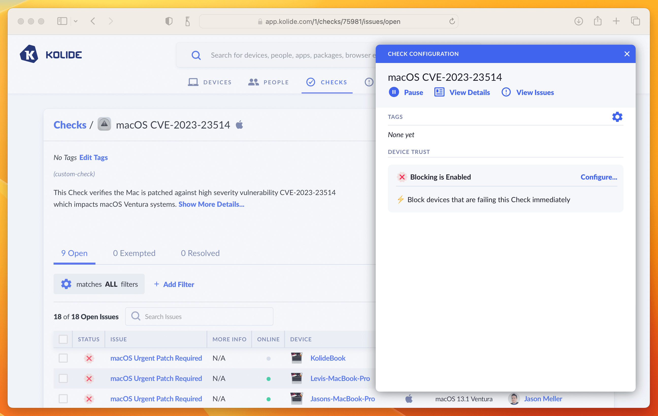As we said in the intro, this is where you can determine how aggressively you want to mitigate this vulnerability, balancing that around the productivity of end-users. For our own Kolide employees, we thought this vulnerability was serious enough to warrant an immediate block. That said, giving folks an extra day is also a reasonable choice depending on your risk tolerance. If that’s the case, simply click the checkbox where it warns you about blocking devices and decide on a date in the future when you’d like the blocking to start.